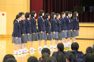 「校歌のプレゼント」では、「歌詞」を手渡すだけでなく、合唱部と3年有志が1年生の中に入って一緒に歌いました。