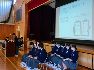 本日、生徒大会が行われました。この会のために、本部役員や専門委員長の皆さんが資料作成やリハーサルなどの入念な準備を行い、本日は堂々と活動目標や計画について述べました。全校生徒で確認した生徒会活動を皆さんで盛り上げ、これからの島二中の学校生活をより豊かにしていきましょう!